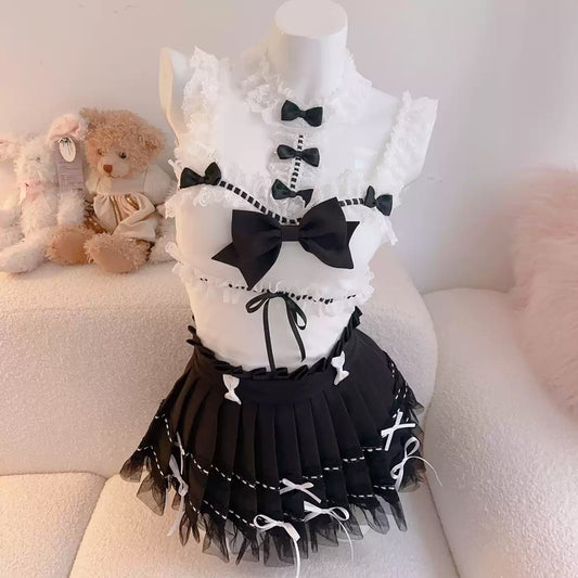 Pink and white lace princess top with bow pleated skirt PA20002