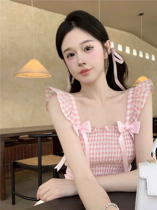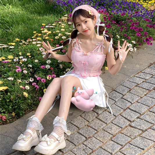Striped short-sleeved shirt top + high-waist pink suspender skirt PL53424