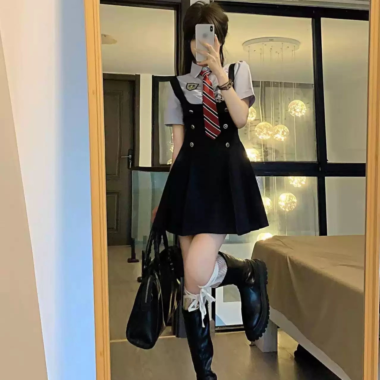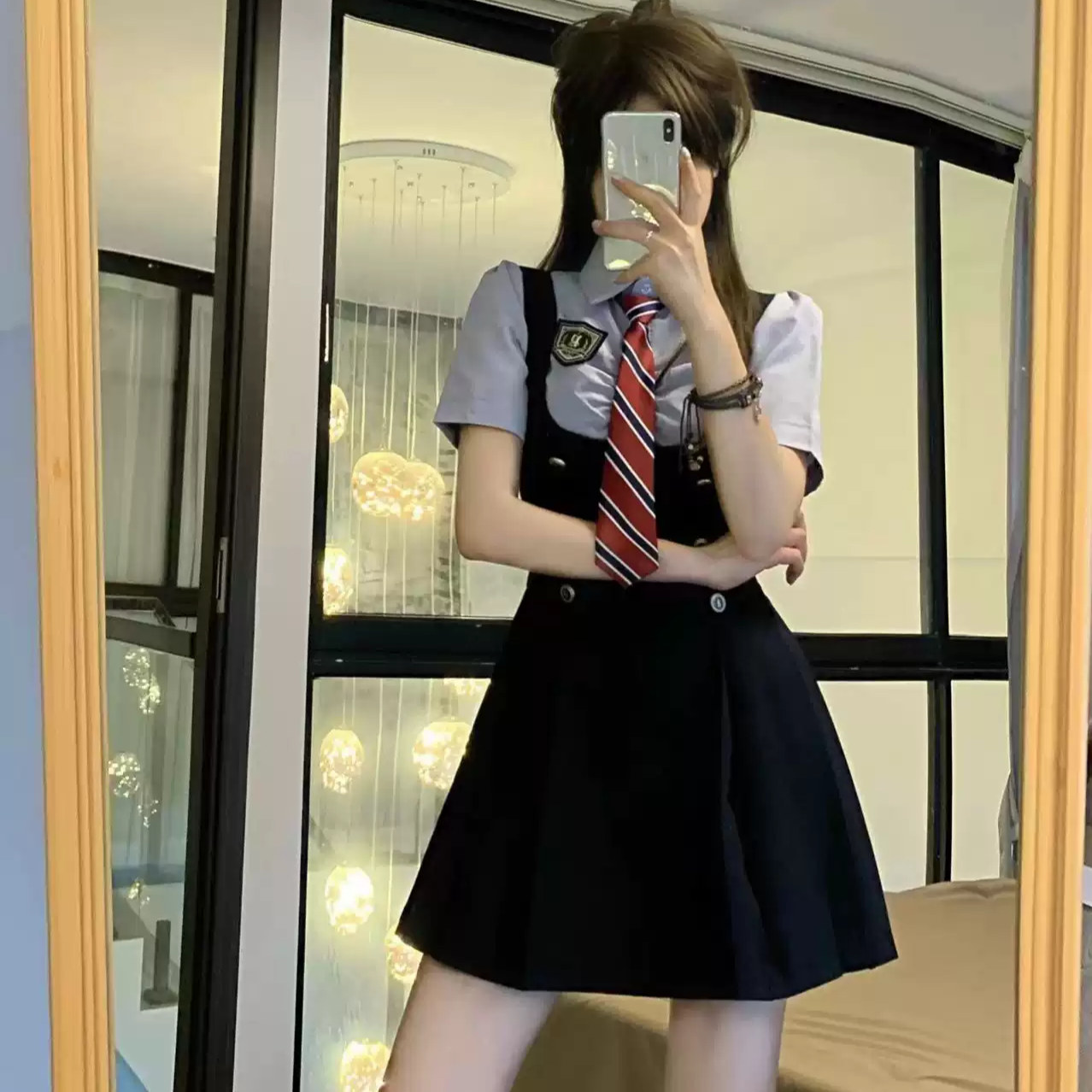 Includes:[Sea Mist Blue Overall Skirt + Waist Shirt + Striped Tie] + Free Badge