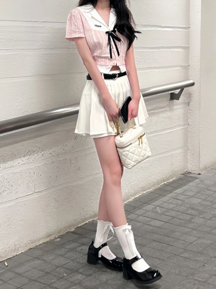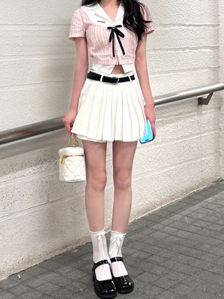 Color: Pink shirt + high waist skirt
