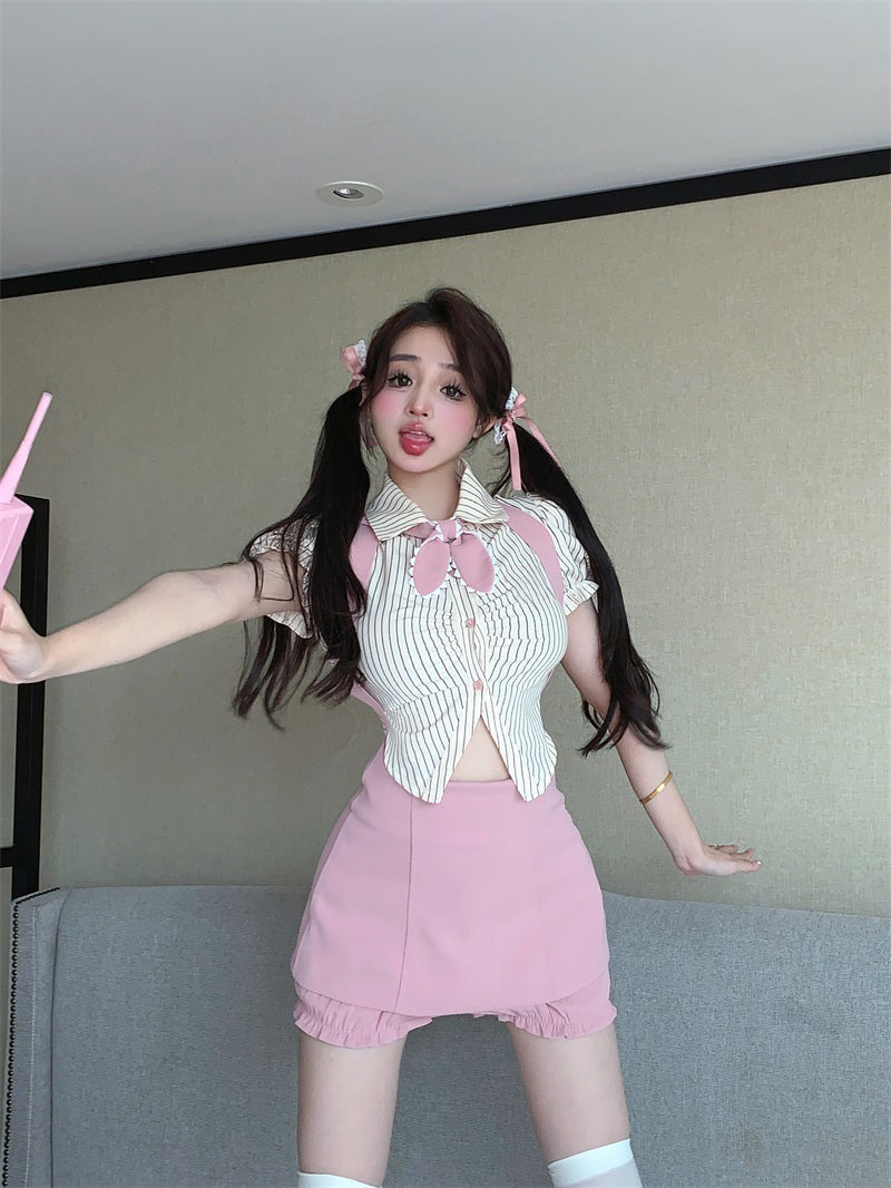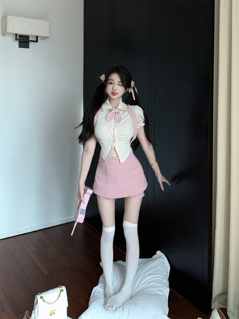 Striped short-sleeved shirt top + high-waist pink suspender skirt PL53424