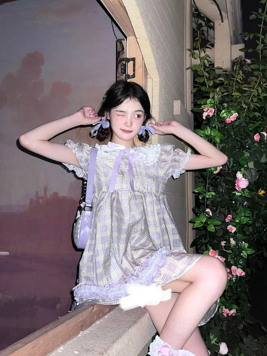 Puff Sleeve Lace Bow Dress PL53243