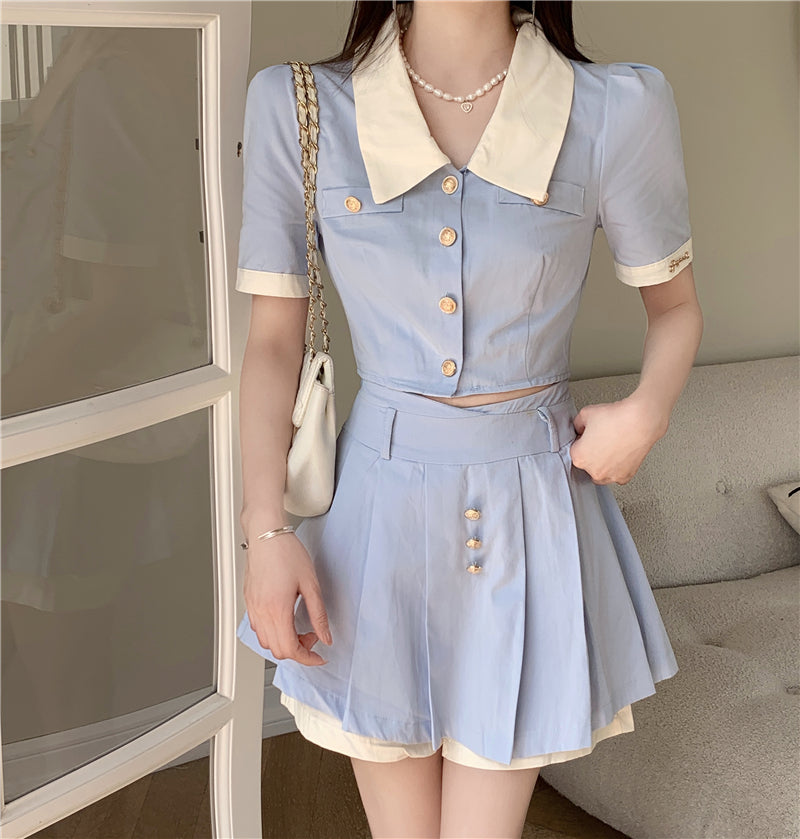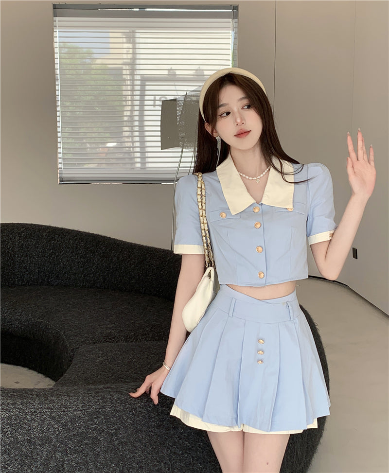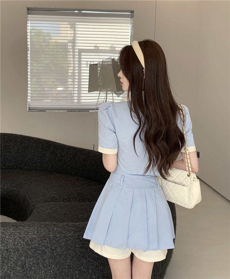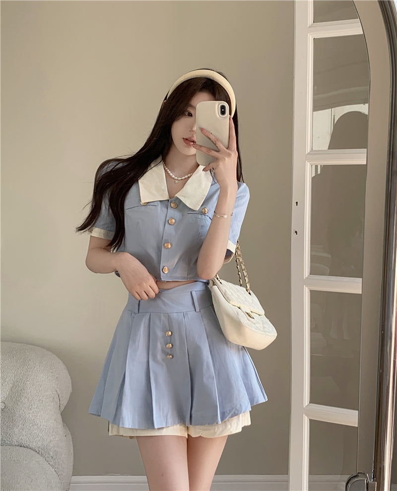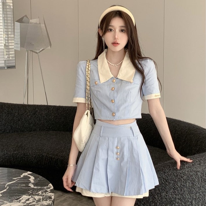 Blue short shirt top + high waist pleated skirt two-piece set PL53504