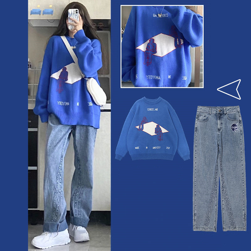 Color: Blue sweater + jeans two-piece set