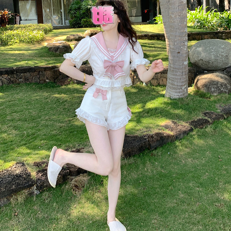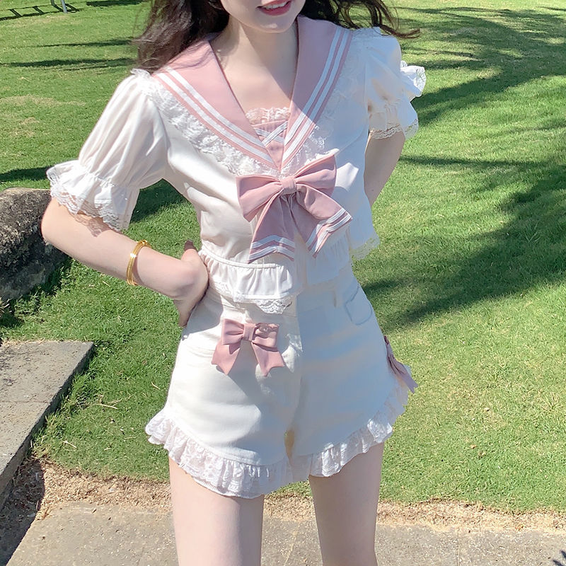 Bowknot Navy Collar Puff Sleeve Top + High Waist Lace Shorts PL53411