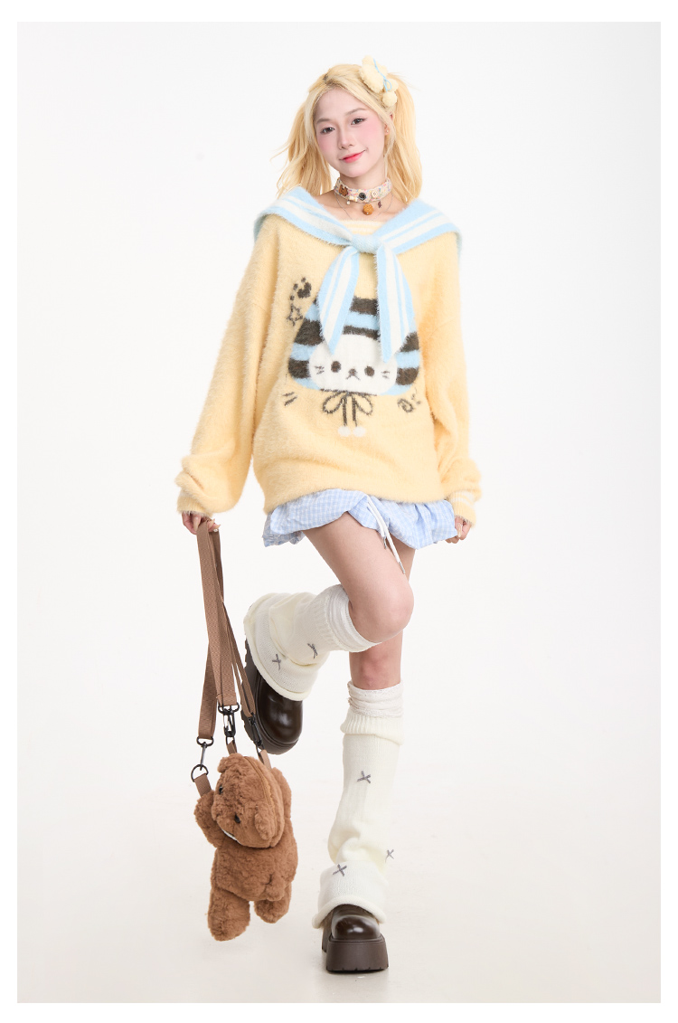 Cat jacquard navy collar sweater PA20162