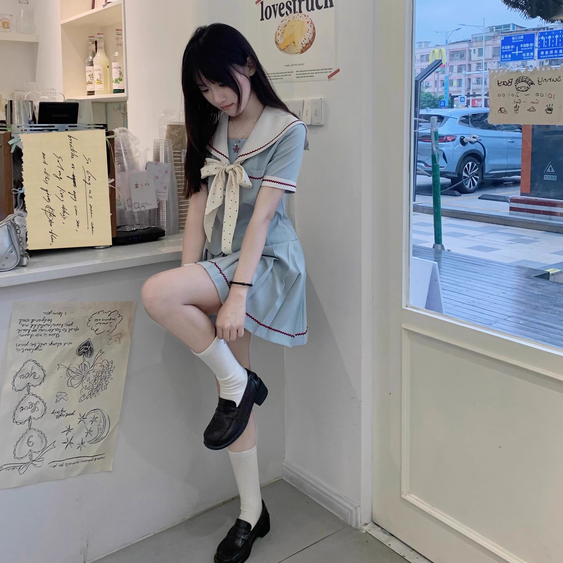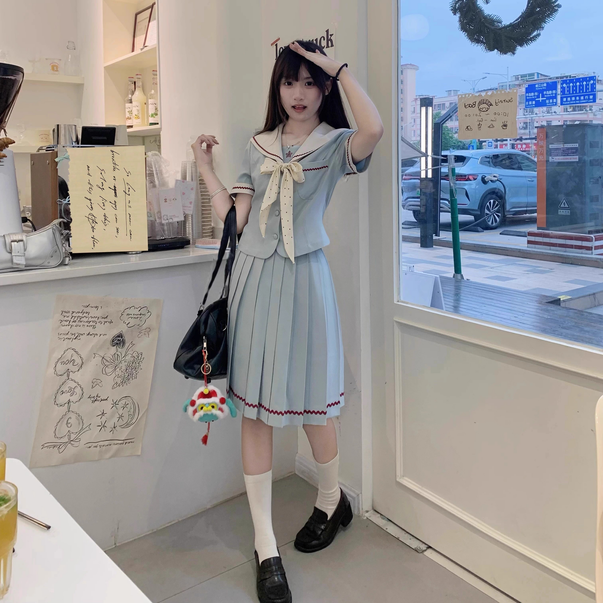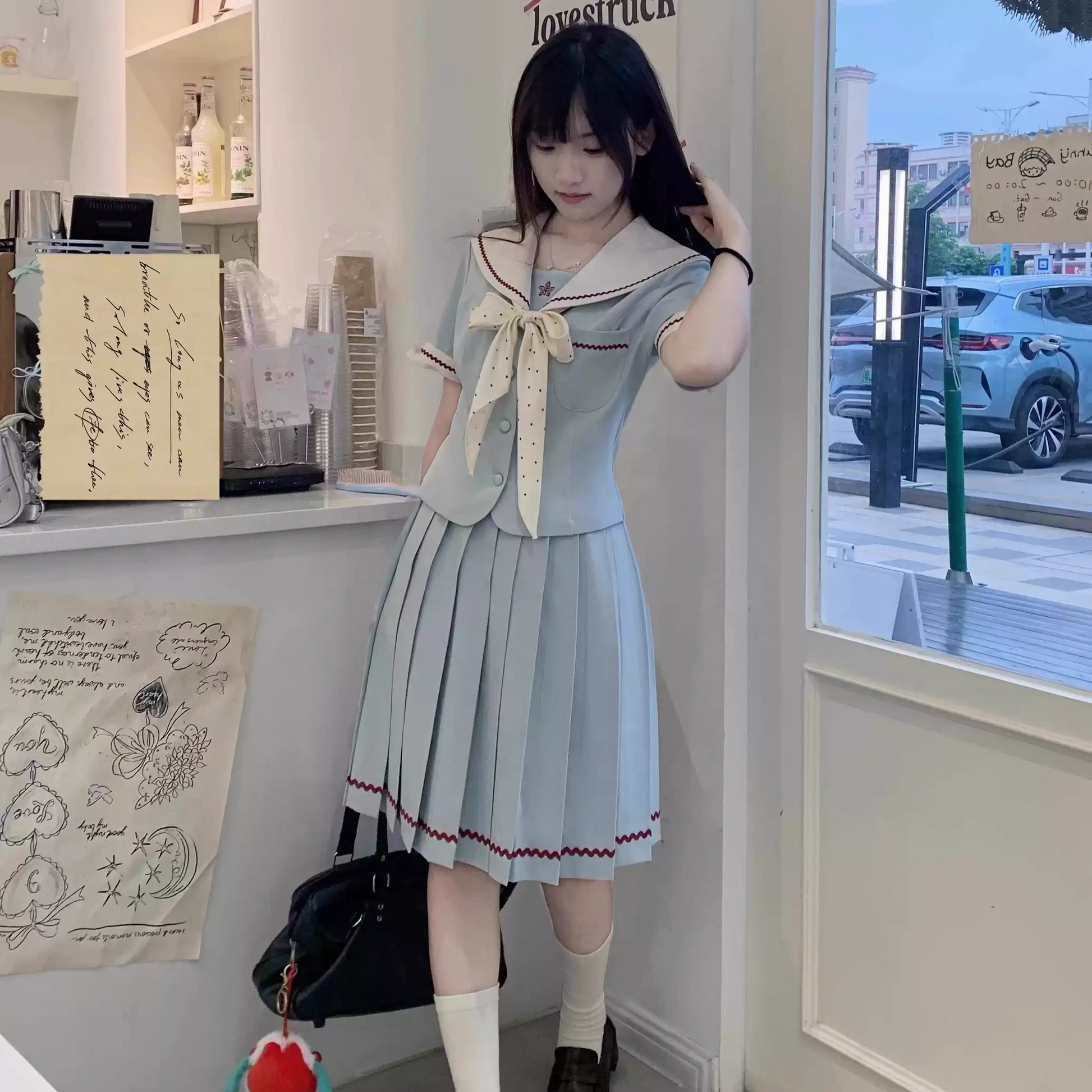 Includes: short-sleeved top + short skirt 42cm + bow tie
