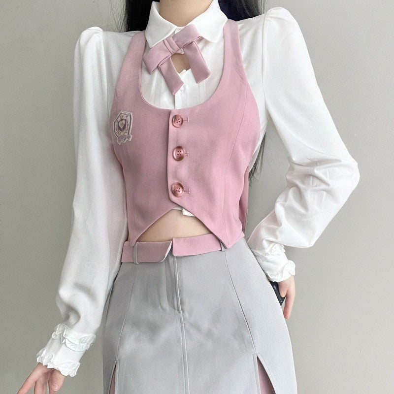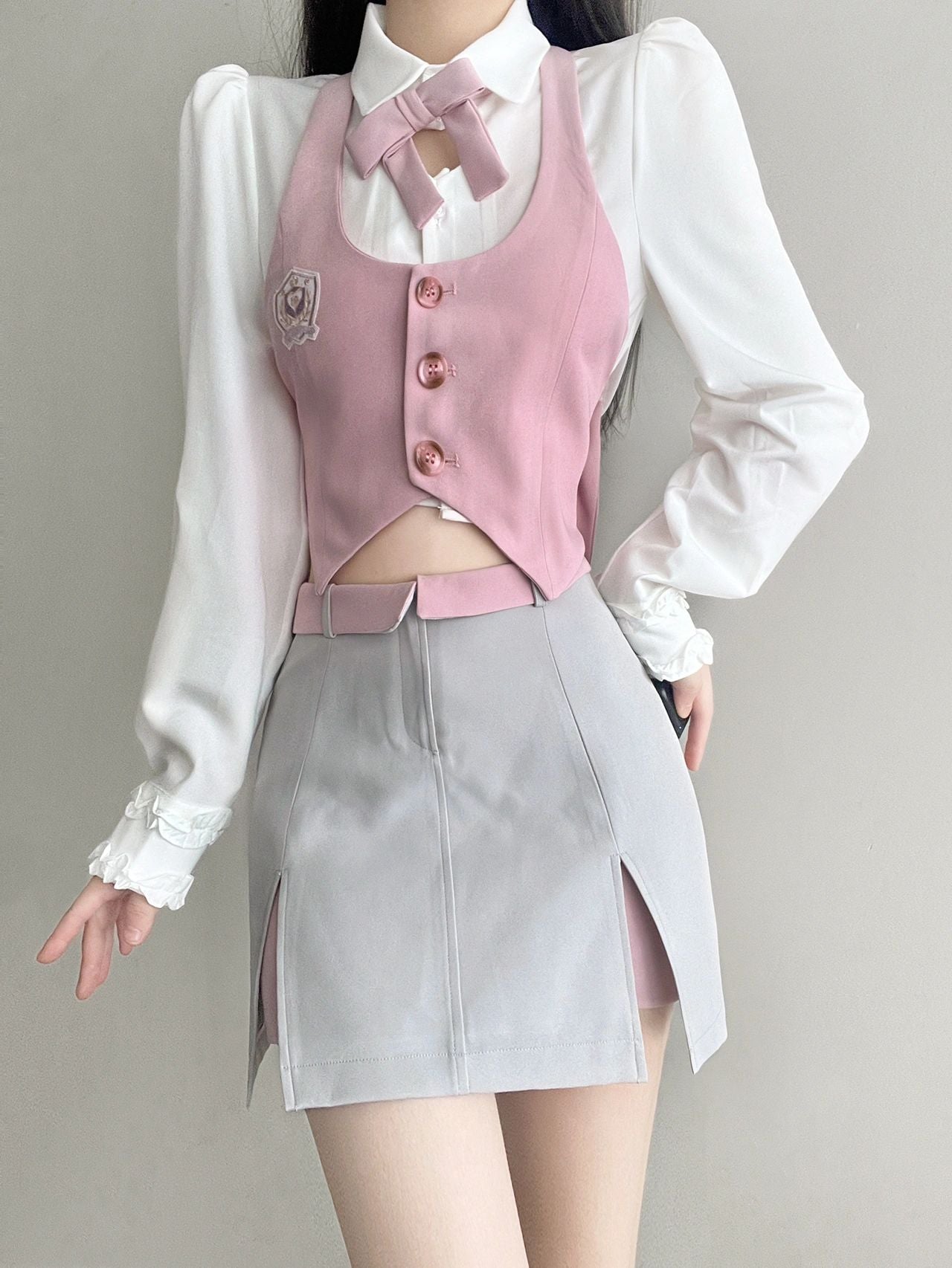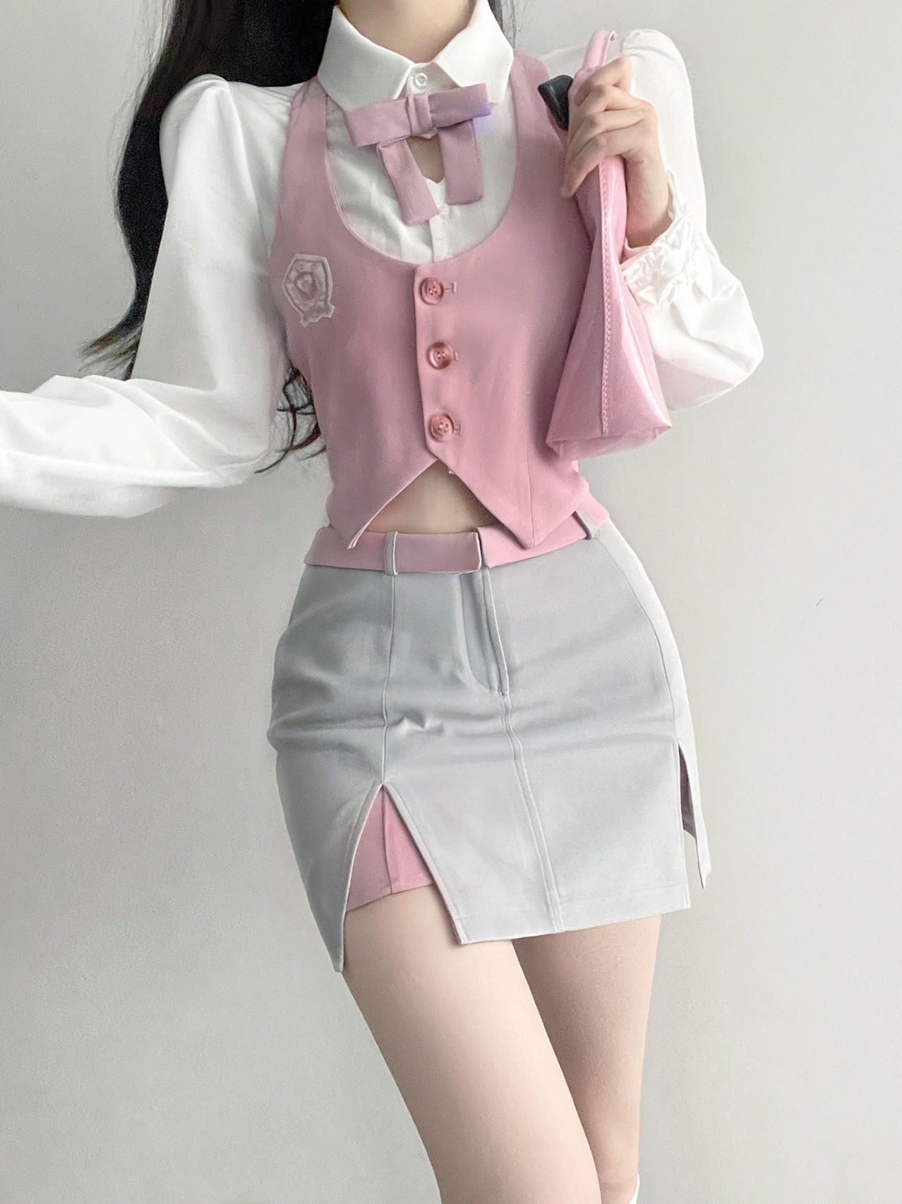Color: White top + bow tie + pink vest + badge + gray skirt