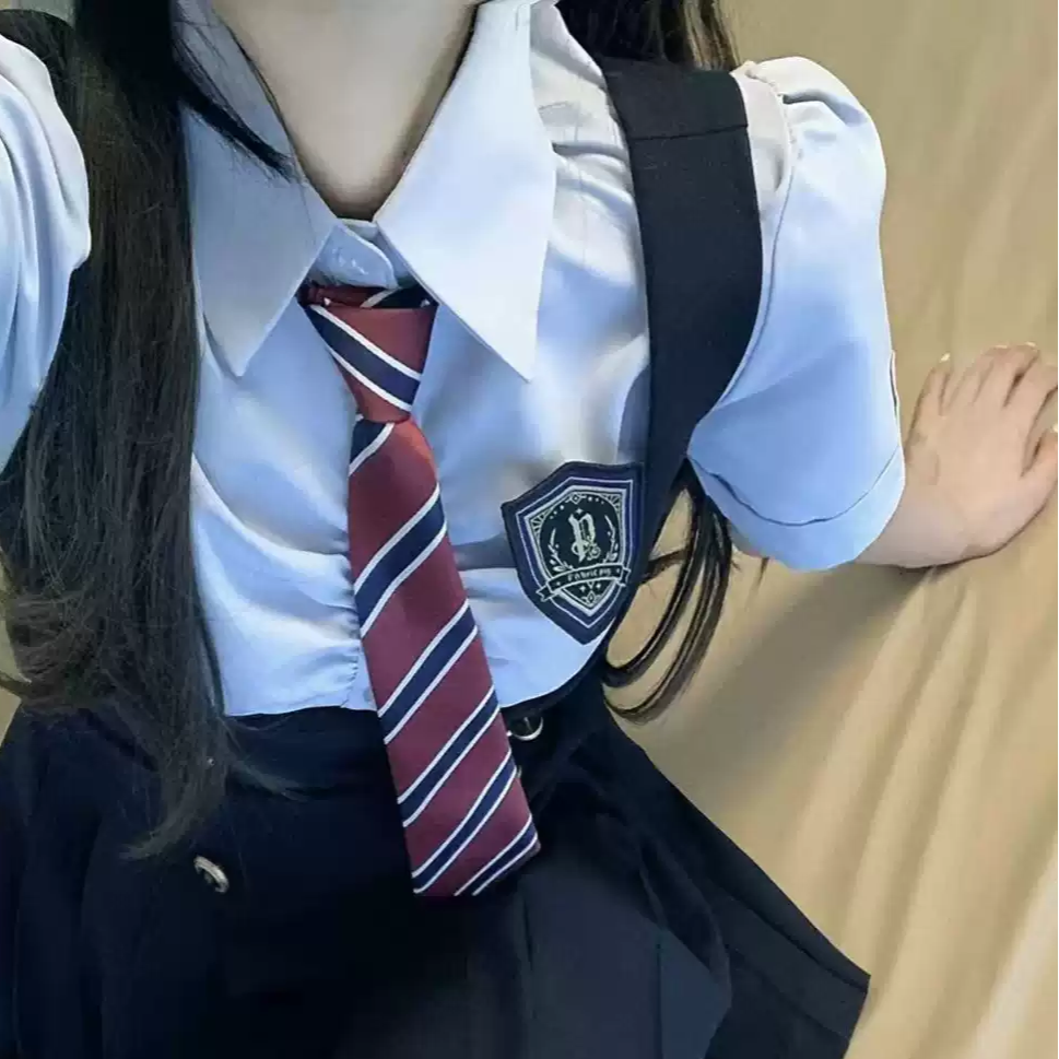 Includes:[Sea Mist Blue Overall Skirt + Waist Shirt + Striped Tie] + Free Badge