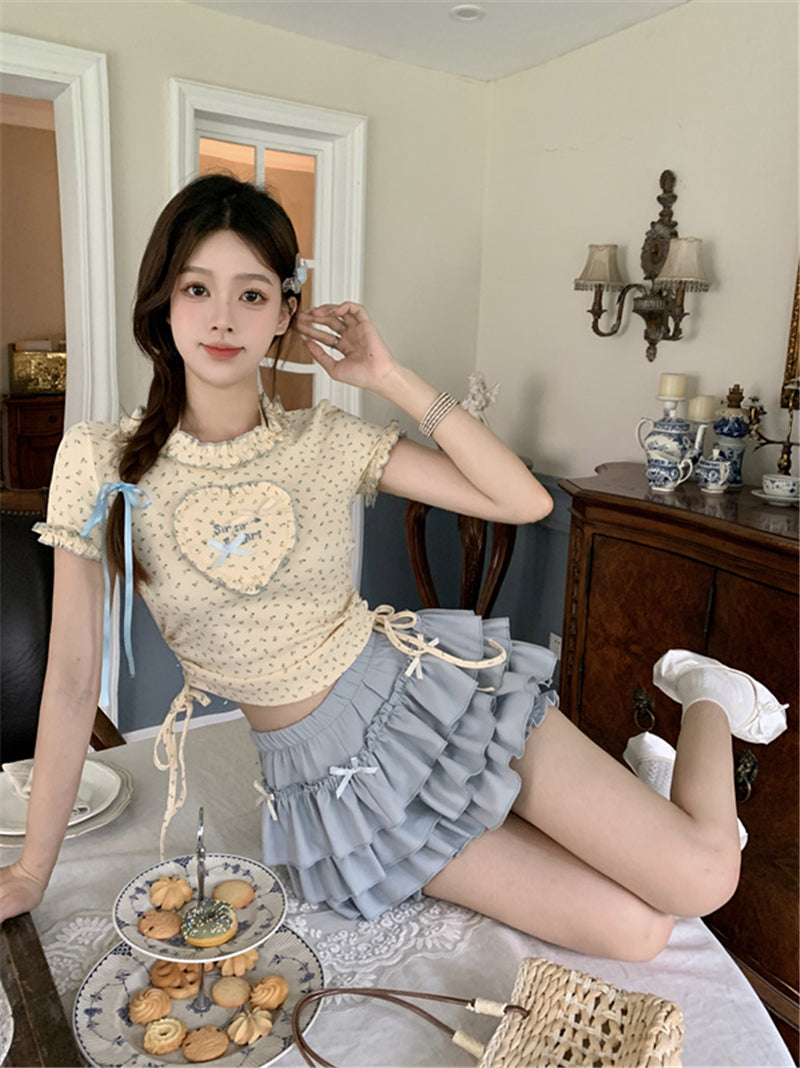 Love short-sleeved T-shirt + bowknot blue cake skirt PL53377