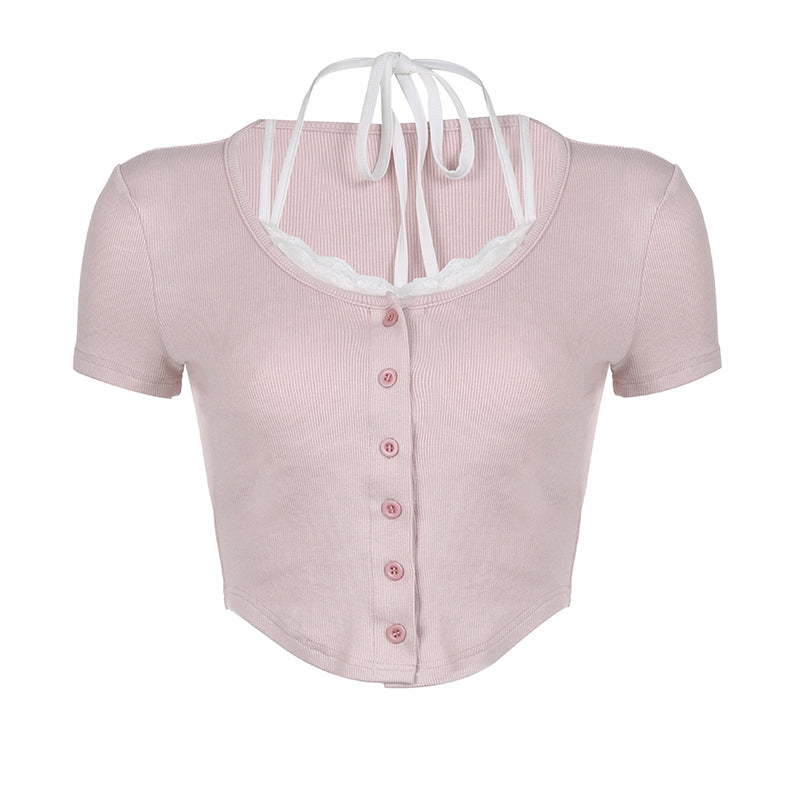 Slim Fit Halter Neck Tie-Breasted Short-Sleeve Top PL53440