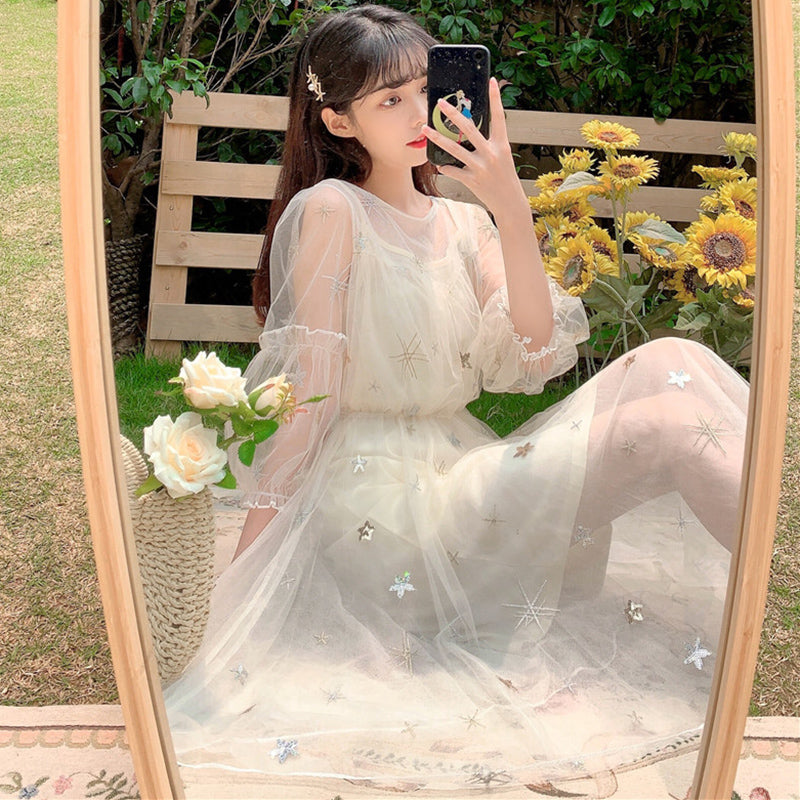 STAR EMBROIDERED MESH SLIP DRESS PL52274