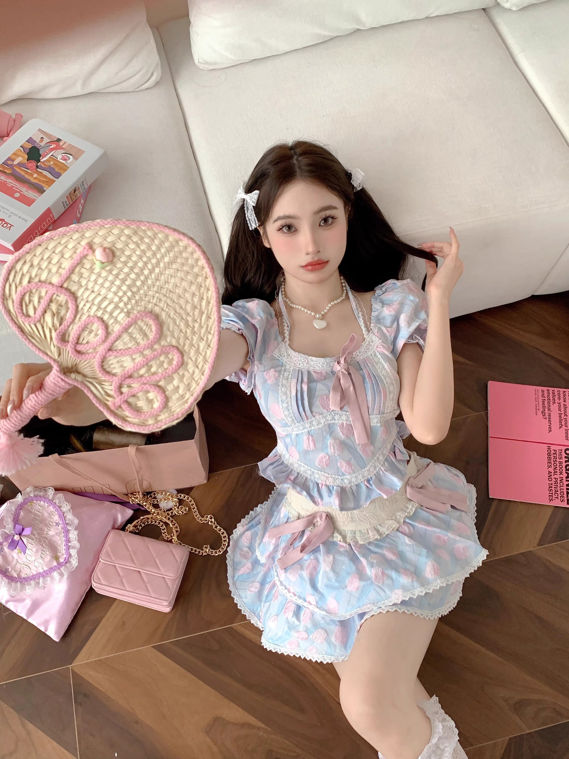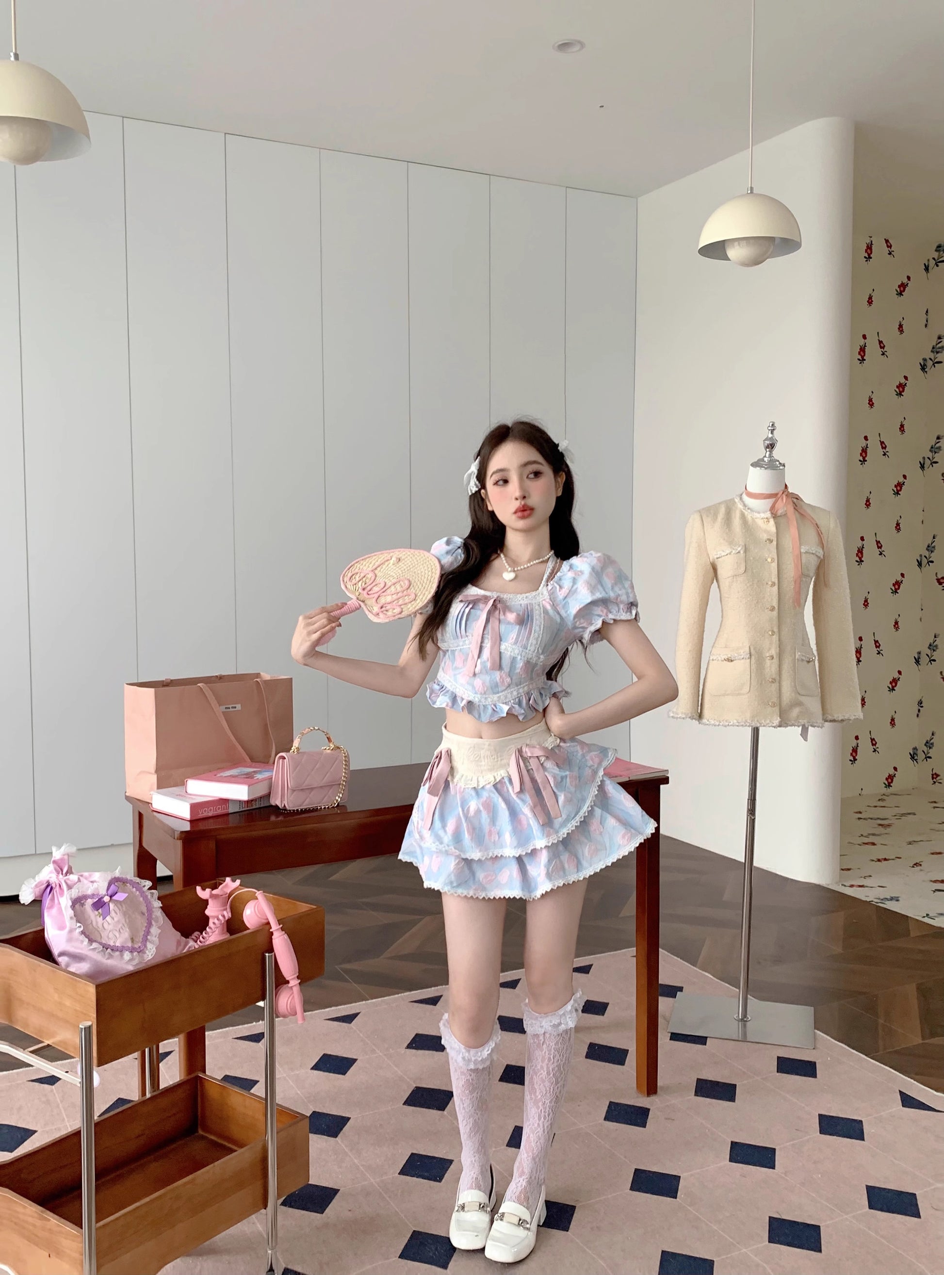 Sweet and cute puff sleeve top + high waist skirt PL53507