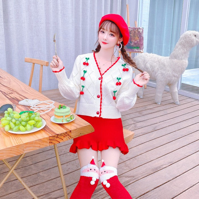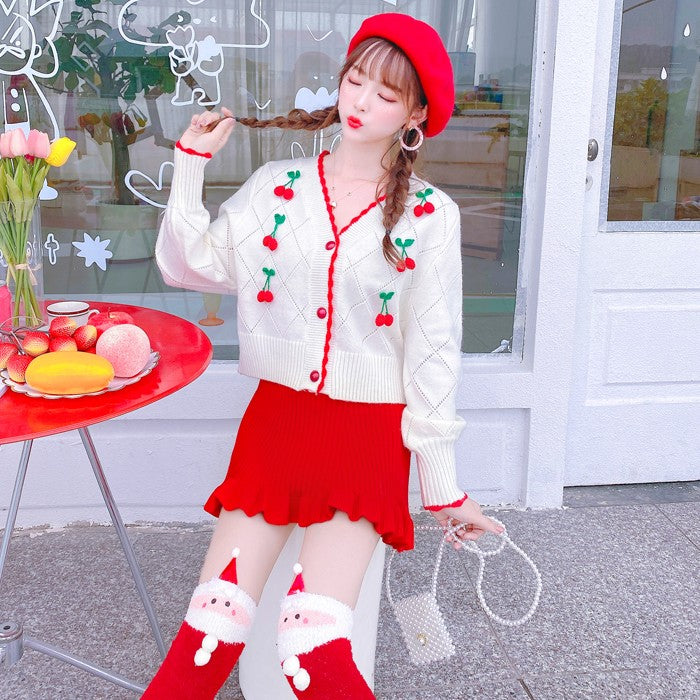 White knitted sweater + red skirt two-piece set PL52515